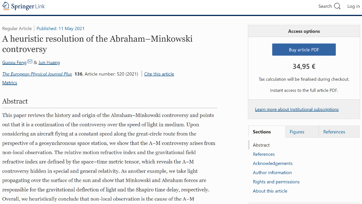 冯国旭博士后和黄俊教授用非常规方法解决了亚伯拉罕-闵可夫斯基百年争议,成果发表在European Physical Journal Plus期刊(Q1,影响因子3.228)。论文的研究方法源自于飞机的大圆导航方程和军用飞行器对雷达隐身突防效能仿真建模中采用的电磁波传播理论。