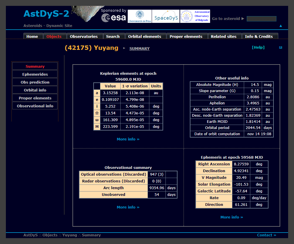 图1. 42175号小行星“Yuyang”(数据来自AstDyS-2小行星数据库)