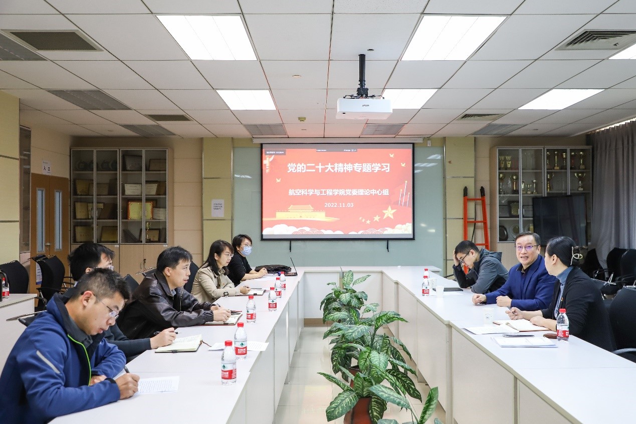 鲍蕊首先结合学院工作,从两方面分享了心得体会。一是坚持和加强党对学院工作的全面领导,构建新的发展格局,推动学院高质量发展。学院70年发展历程的成绩是值得肯定的,但也必须认识到目前的严峻形势。需要学院党委和院班子每一位成员有担当,有定力,不畏困难。从真刀真枪地解决领域的卡脖子问题,到脚踏实地地解决学院发展中地真问题。二是紧密围绕科教兴国战略的核心要义,建好专业人才队伍,进一步提升面向航空航天强国创新型人才培养质量和面向国家重大战略需求的有组织的科学研究水平。就面向航空航天强国的创新型人才培养,我们要深刻把握为谁培养人、培养什么样的人、怎么培养人的问题。对于面向国家重大需求的有组织的科研,要以国家重大战略需求为导向,集聚力量进行原创性引领性科技攻关,坚决打赢关键核心技术攻坚战。