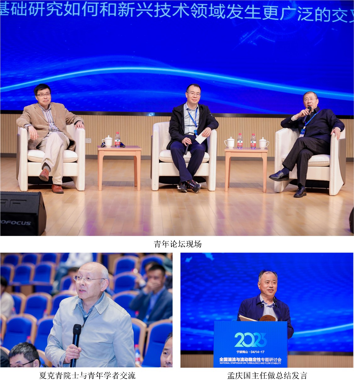 会议青年成长论坛由袁先旭研究员主持,北京航空航天大学孙晓峰教授、上海大学刘宇陆教授、中国船舶集团有限公司技术首席颜开研究员就“如何让湍流基础研究在‘四个面向’中发挥更大作用”,“从事湍流基础研究的青年科技人员的成长路径有哪些”,“基于超大规模数据的深度学习能否改变湍流研究范式”,“湍流基础研究如何和新兴技术领域发生更广泛的交叉”四个问题与在场专家及年轻学者们展开深入交流讨论,获得了热烈掌声和共鸣。最后,国家自然科学基金委数理学部孟庆国副主任做总结发言,重点谈及了流体力学研究的现状、困境、机遇和未来发展路径,孟主任鼓励广大从事湍流基础研究的青年科学家把个人事业发展融入国家发展的大格局中,立足国家重大需求选好研究方向,坚持守正创新,沉下心来做解决真问题的原创研究,坚持合作交流集智攻关,让湍流研究的道路越走越宽。