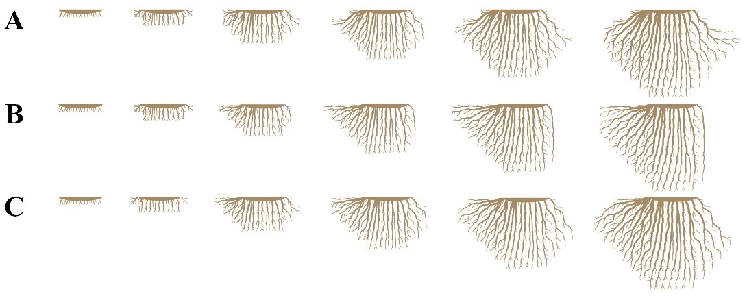图3.不同直根系的生长演化:(A)向地性较强;(B)向水性较强;(C)向地性和向水性相当