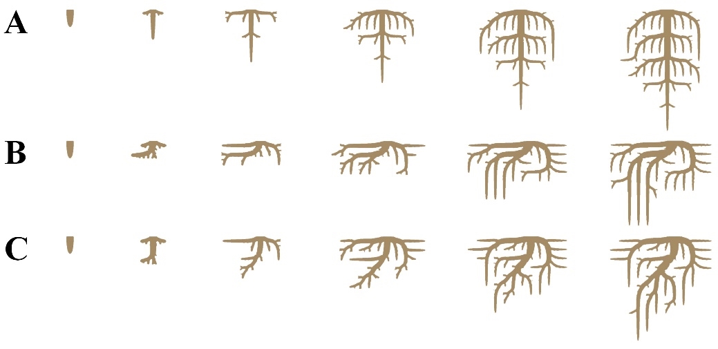 图4.须根系的生长演化:(A)向地性较强;(B)向水性较强;(C)向地性和向水性相当