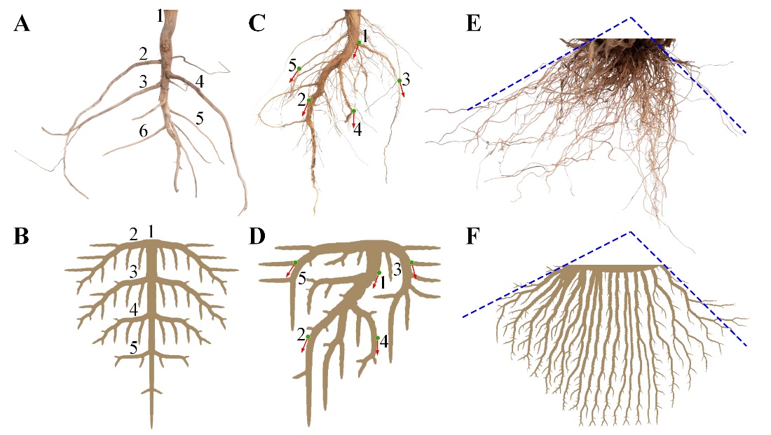 图5.实验观测(上)和计算模拟(下)结果对比。不同植物的根系:(A)与(B)荠菜;(C)与(D)苦苣菜;(E)与(F)早熟禾
