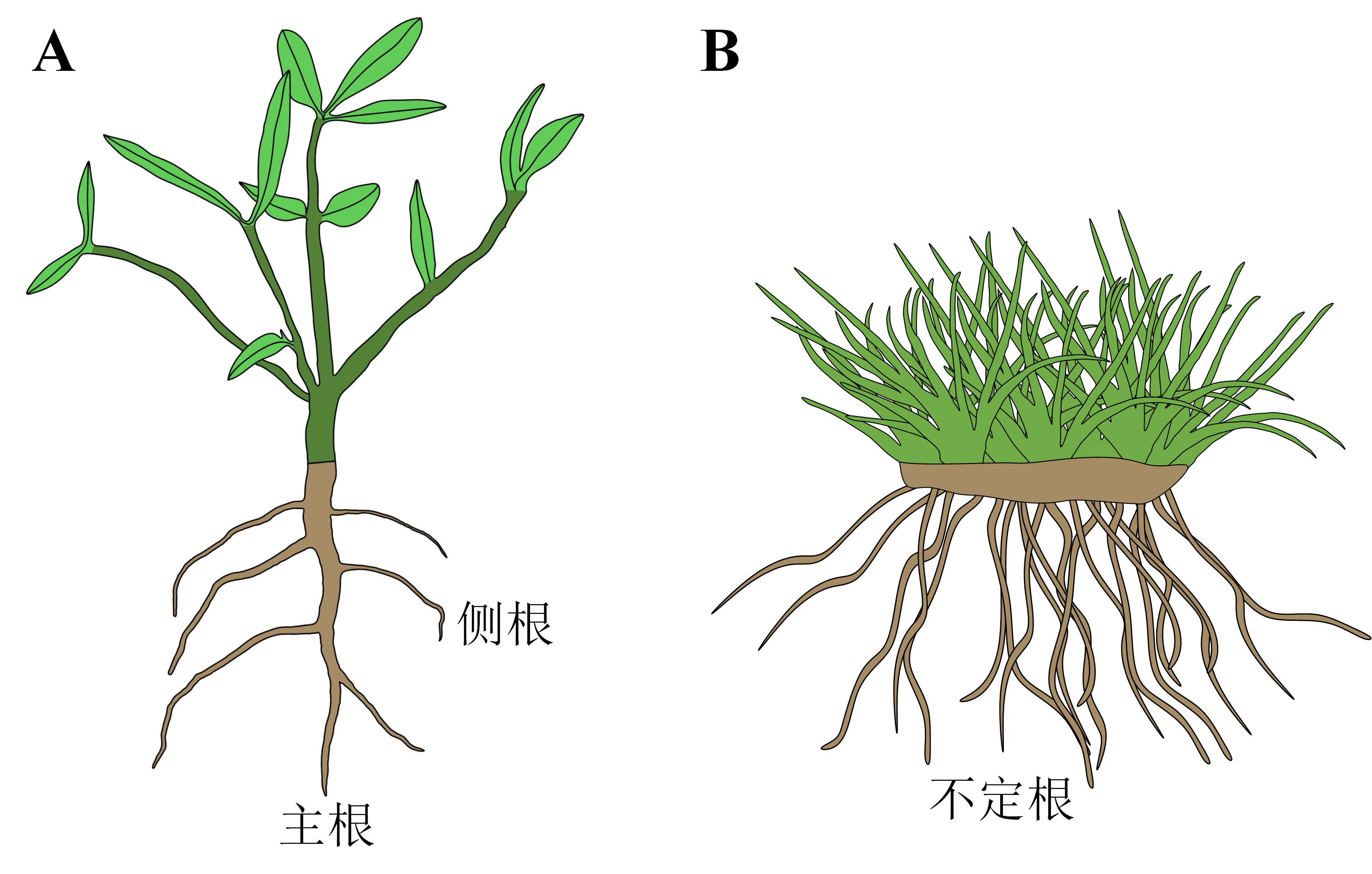 图2.两种根系:(A)直根系与(B)须根系