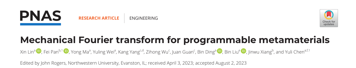 潘飞副教授、陈玉丽教授与向锦武院士、材料学院管娟副教授合作完成的研究成果“Mechanical Fourier transform for programmable metamaterials”(用于可编程超材料的“机械”傅里叶变换)。该工作提出了一种快捷高效的材料/结构力学性能逆向定制方法,将复杂非线性力学性能的逆向设计问题转化为超材料模块的应力应变曲线调幅问题,为先进材料和结构的按需定制设计提供了新的解决方案。手机百家乐网址大全