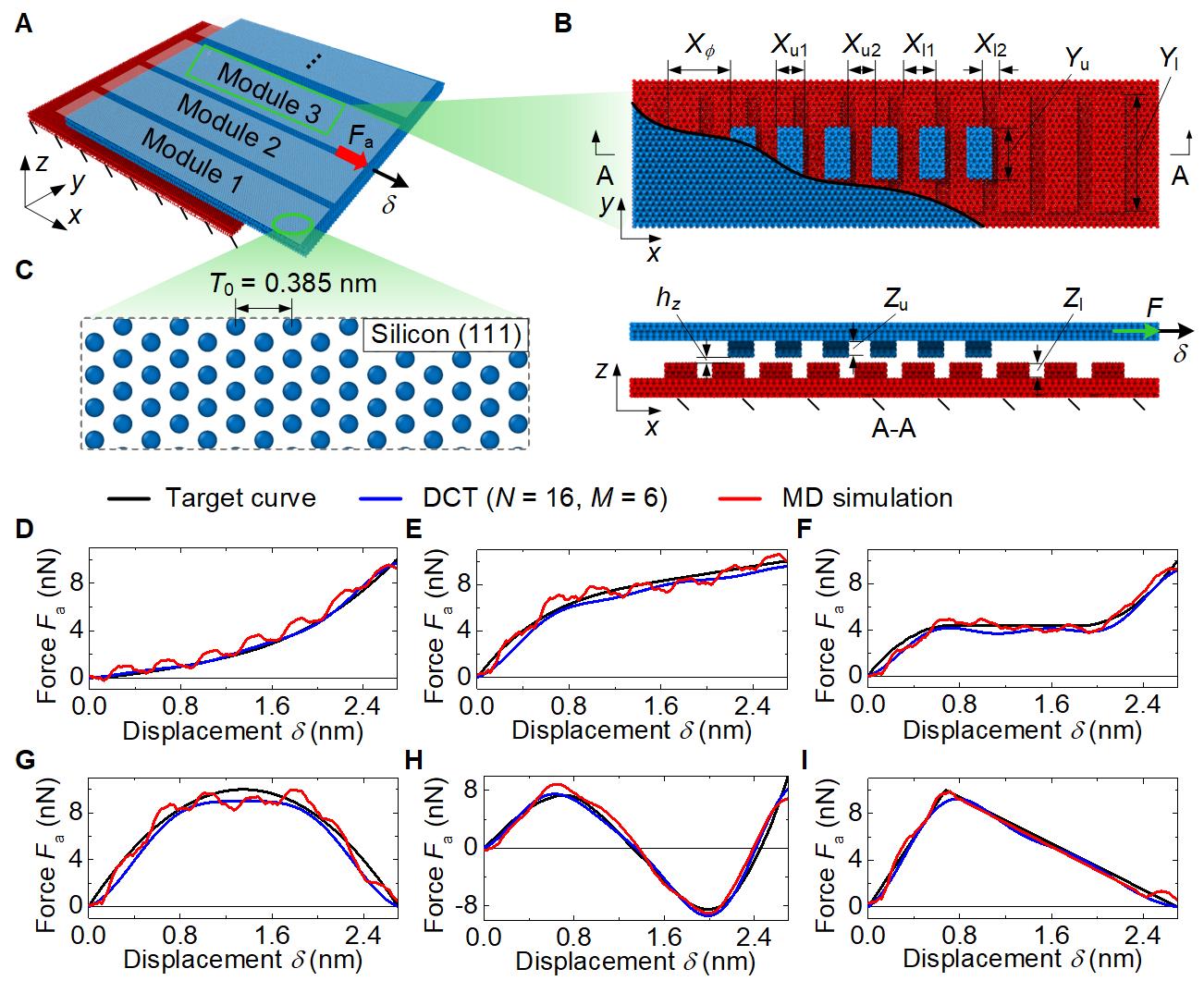 在微观尺度,利用原子间的范德华作用力,在具有周期分布刻蚀图案的硅片滑移界面上实现了余弦和常值的加载曲线,并基于此设计了硅片阵列超材料(图3A-C)。通过分子动力学模拟实现了多种典型目标曲线的快速定制(图3D-I)。