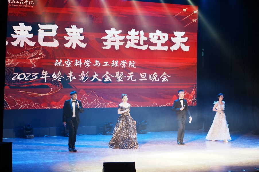 “未来已来,奔赴空天”2023年终表彰大会暨元旦晚会在沙河校区咏曼剧场顺利举办。学院部分领导老师及400余名同学现场观看晚会。