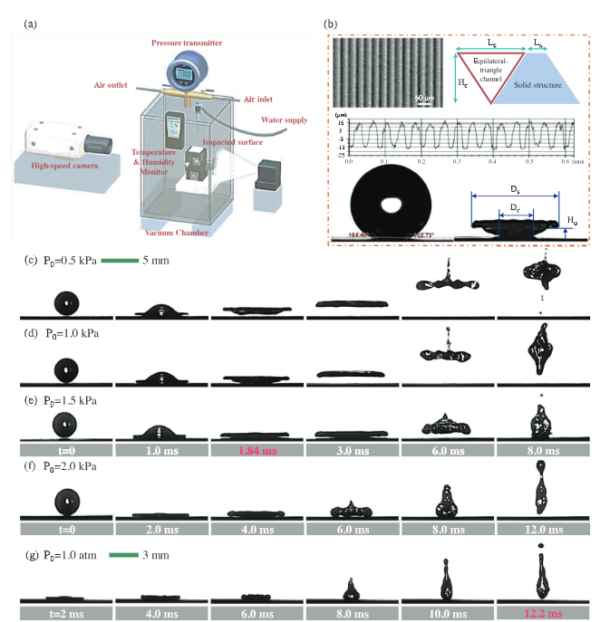 文东升教授团队,在极端环境下超疏水表面基础研究方面取得重要研究进展。团队基于自主设计搭建的低压实验系统,研究发现在室温、近真空(环境压力3 kPa以下)环境条件下,液滴撞击超疏水表面时会发生极快的饼状弹跳现象,液滴与表面的接触时间能够大幅降低85%,达到目前已知最高水平。2024年3月18日,相关研究成果以《Low-pressure Pancake Bouncing on Superhydrophobic Surfaces》为题在线发表于国际知名学术期刊《Small》杂志,并被选为编辑推荐(Editor’ Choice)。