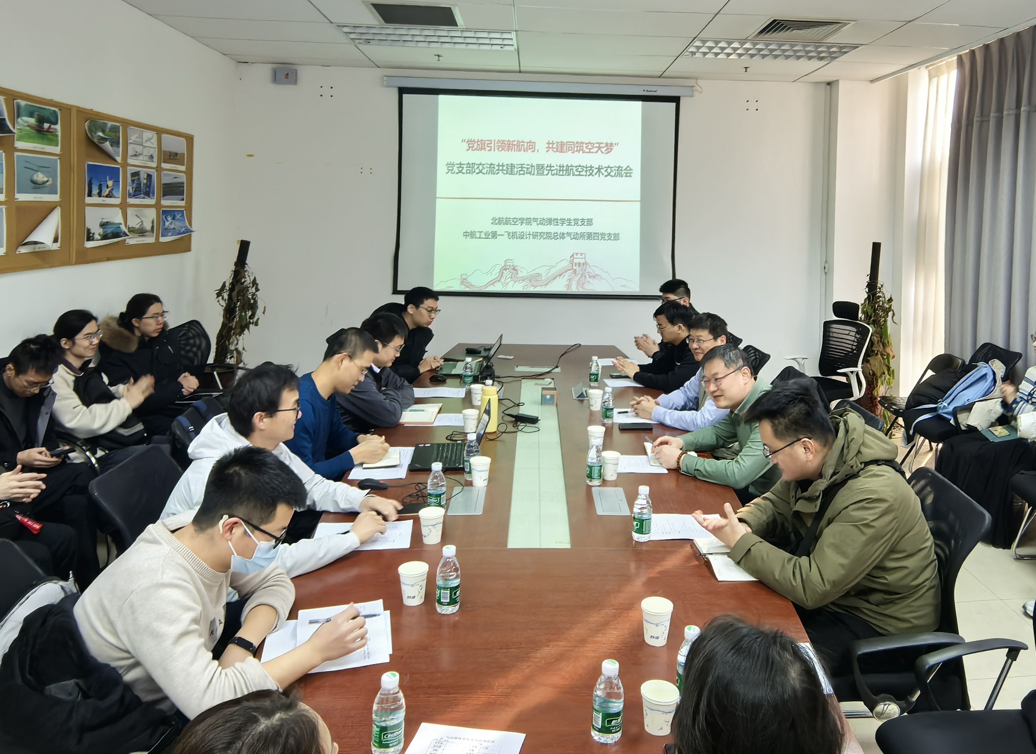 气动弹性学生党支部联合航空工业第一飞机设计研究院总体气动所第四党支部,在北航新主楼 D515会议室开展了支部交流共建活动暨先进航空科学交流会。本次活动以“党旗引领新航向,共建同筑空天梦”为主题,旨在通过党建引领,促进双方在科研业务方面的深入交流与合作。