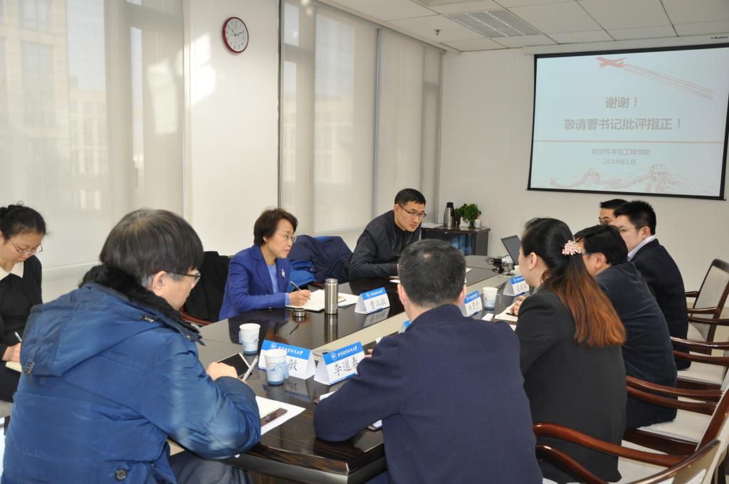 教师的科研情况。在热强度实验室,吴大方教授给曹书记汇报了自己的工作并进行现场演示,曹书记对吴大方教授世界一流的研究成果给予了高度的评价,对吴教授为航空航天事业做出的贡献表示感谢,她说吴教授对航空航天事业的情怀、对北航的情怀让人感动,希望吴老师一定要保重身体,学校也会全力支持热强度实验室的建设,让我们一起为国家的航空航天事业做出更大的贡献。