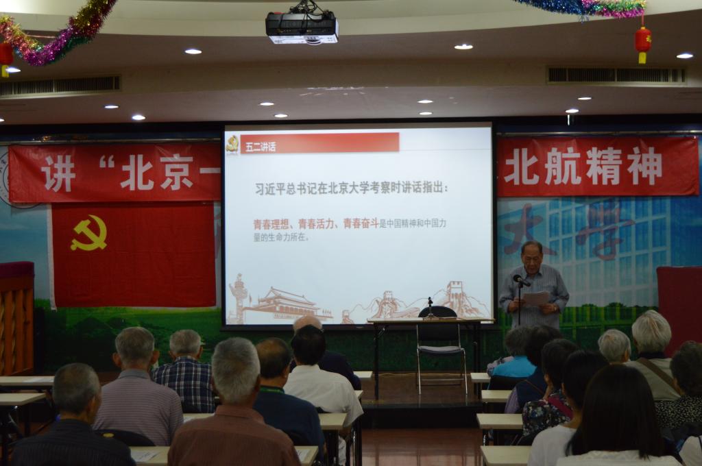 活动开始,退休教师联合党支部杨乃宾老师强调了习近平总书记在北京大学师生座谈会上讲话的重要内容,并向党员同志们提出了学好“五二讲话”、牢记北航校风、传承北航精神的号召。之后,全体老师与学生党员一同观看了记录“北京一号”研制过程的纪录片——《直上云霄》,纪录片勾起了老师们的回忆,几位老师先后跟大家分享了参与研制“北京一号”的故事。