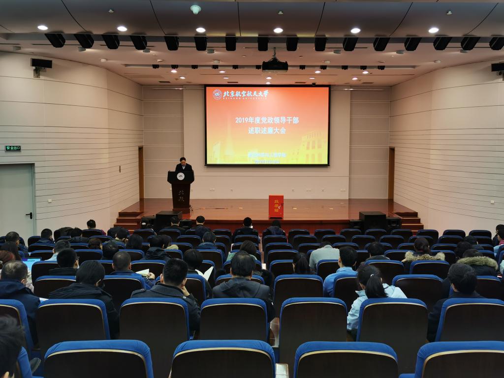2019年度党政领导干部述职述廉大会在新主楼第二报告厅召开,学院全体教职工参加,会议由党委书记林贵平主持。
