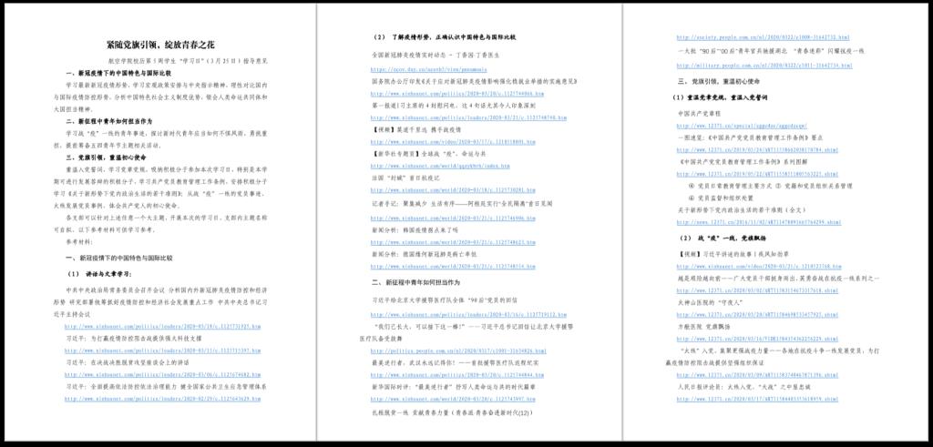 本研学生广泛开展线上“学习日”,16个研究生学生党支部、3个本科年级大班组织共开展了27场“学习日”活动。为进一步提高学习质量,学院提前策划布局,制定发布第5周学习日指导意见,凝练多个主题,并提供详实贴切的参考资料,各研究生当支部、本科生班级围绕大国担当、青年使命、党员初心等多个主题,站在国家、青年、党员多个维度,通过邀请宣讲团、主题微党课、大班会、小班会等多种形式集中学习,并采取小组讨论、感想交流等形式进行理性思考,深化学习效果。同学们学讲话、讲事迹、观大局、话担当,深刻领会全民战“疫”凸显的中国特色社会主义制度优势,热烈探讨青年学生如何树立远大理想、练就过硬本领、牢记使命担当,思考怎样不惧风雨、勇挑重担,让青春在党和人民最需要的地方绽放绚丽之花。