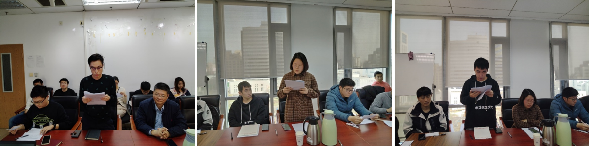 大会第一项,讨论预备党员接收问题。支部书记周明昊同志介绍了会议流程,三名发展对象分别宣读入党志愿书,就对党的认识、入党动机、个人情况进行汇报。根据发展流程,支部大会对三位同志逐个讨论并进行表决,大会认为,三位同志已基本符合共产党员标准,一致同意接收王培涵、李金瑛、揭宇三位同志为中共预备党员。