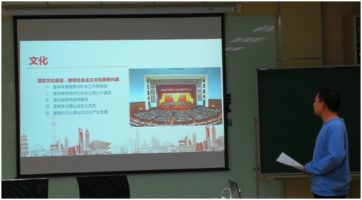 王成欢同志结合我国当前的文化发展实际,介绍了近五年来我们国家在文化方面取得的极大成就,同时也指出了文化发展存在的一些问题,并在最后给出了他们小组的建议。