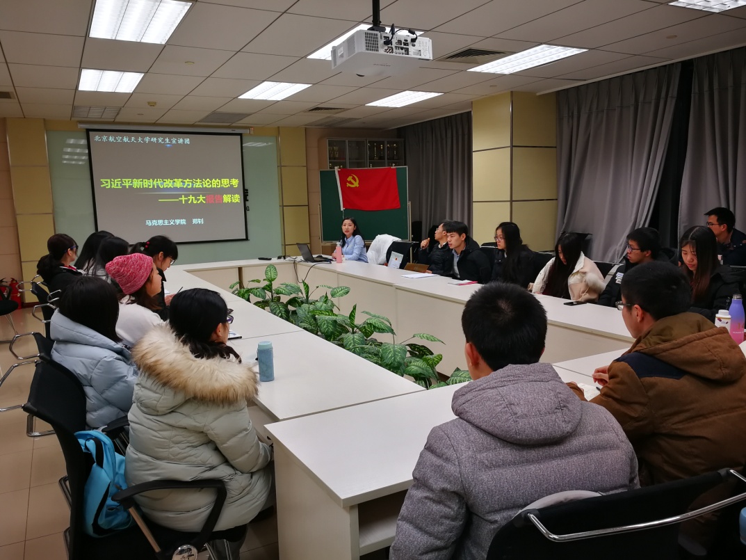 研究生硕士17052党支部与硕士17054党支部一起在C708共同学习了十九大精神北航研究生宣讲团系列活动主讲人之一,马克思主义学院郑钊同志的宣讲。党员们的热情高涨,C708座无虚席,其中SY17052党支部参与人数为17人,ZY17054党支部参与人数为14人,还有部分博士党支部成员参与学习。