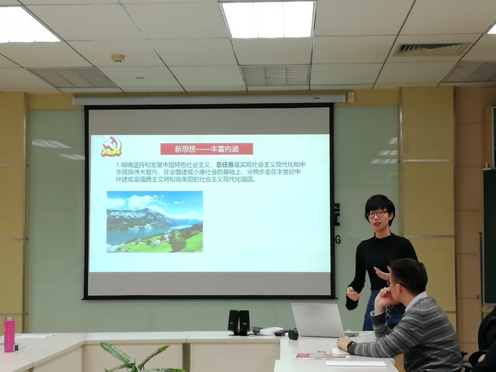 会议在嘹亮的国际歌声中开始,王雪晴首先概述了十九大的议程和大会相关的主要文件,并对一些十分重要但之前没有引起同学们足够重视的细节进行了解读。王雪晴紧密围绕十九大报告内容,结合过去几代人和自身的亲身经历,说明了建国以来中国走过的历史变革以及社会主要矛盾变化历程,加深了同学们对十九大开幕会上习近平总书记提出的“中国特色社会主义进入新时代,我国社会主要矛盾已经转化为人民日益增长的美好生活需要和不平衡不充分的发展之间的矛盾”的理解,让同学们更加明确了“五位一体”的中国特色社会主义事业的总体布局,和“四个全面”战略布局的重要意义。
