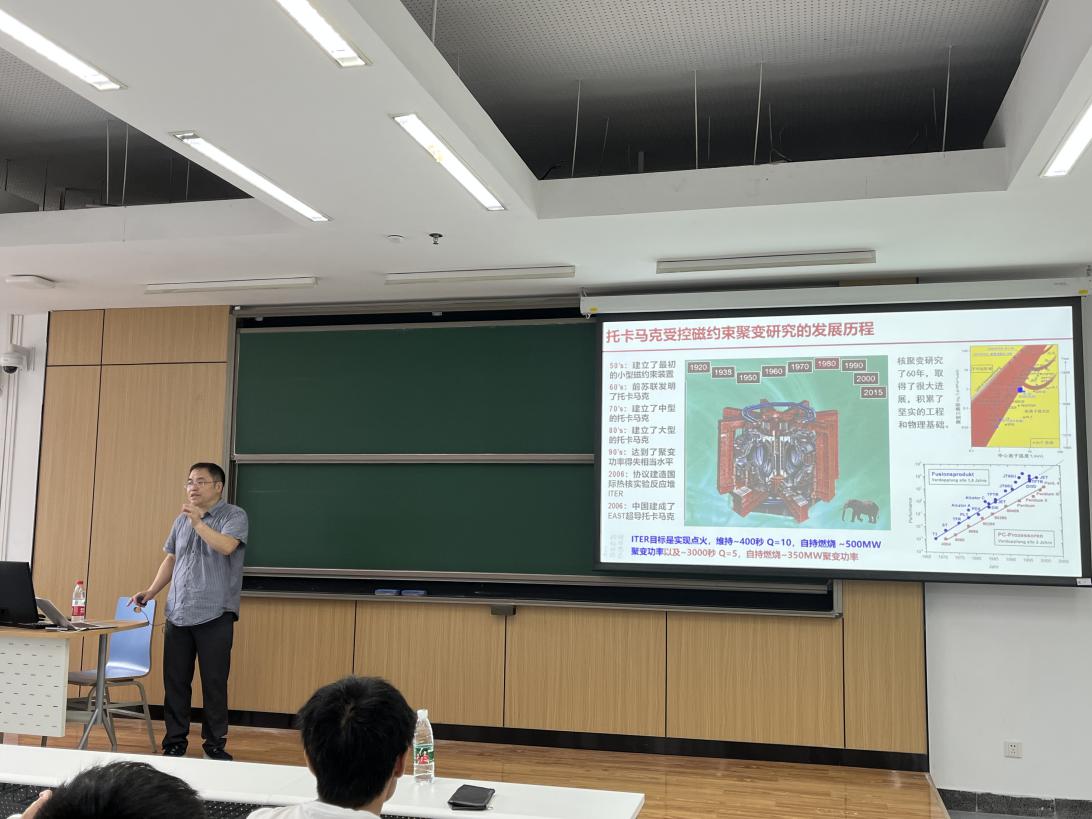 倪明玖教授的报告首先简要介绍了托卡马克装置(又称“人造太阳“)的研发意义,随后讲述了托卡马克装置研发中包含的各类力学基础问题,并着重介绍了磁场作用下的液态金属流动与传热这一极端条件下的多学科交叉耦合问题。在此基础上,讲授了液态金属电磁流体力学的本构方程和数值计算方法,介绍了其团队在此类问题中的最新研究进展。与会师生针对报告内容与倪明玖教授进行了热烈讨论。