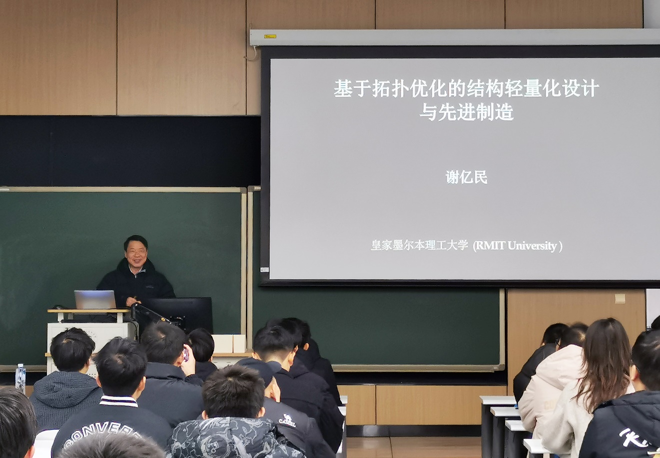 谢亿民院士的报告旨在介绍如何通过拓扑优化技术开展结构轻量化设计。先进的拓扑优化技术是实现结构轻量化设计的重要途径。渐进结构优化法(Evolutionary Structural Optimization, ESO)由谢亿民院士于1992年创立。经过三十多年的不断拓展和完善,渐进结构优化法在工程和建筑领域得到了广泛的实际应用。该方法的基本思路简单明了,即逐渐去除结构中的低效材料,或逐步将材料从低效区域转移至高效区域,最终获得重量轻而性能高的设计。渐进结构优化法易于实现,有着广泛的应用前景,从飞机与汽车的减重降耗,到建筑与桥梁的美观构造,该方法都能提供新颖而高效的设计。本次报告谢亿民院士介绍了渐进结构优化法及其团队研发的Ameba软件在国内外结构设计领域的应用,以及利用增材制造等先进技术来实现拓扑优化设计的一系列案例。与会师生针对该学术报告提出的优化方法与案例进行了热烈的讨论。