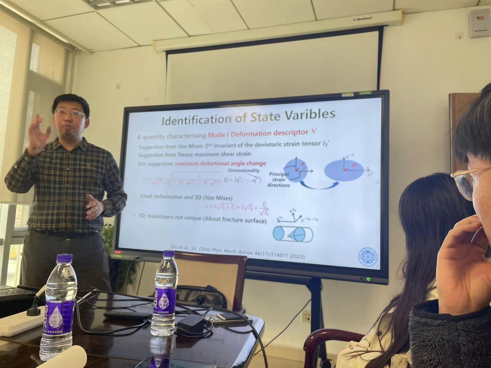 朱一超教授的报告旨在讨论如何在宏观尺度建立计及关键细观信息之跨尺度模型的思想与方法。报告的研究对象统称“广义复合材料”,其特点是结构跨空间尺度,但细观尺度仍在连续介质力学的范畴。报告首先以可3D打印之广义点阵结构为应用背景,讨论如何利用传统渐近分析方法与新兴机器学习工具之间的天然互补特征,“自下而上”地发展跨尺度建模与仿真方法。利用渐近分析,可对宏观(非线性)力学响应与细观(非线性)单胞问题的跨尺度关联关系进行定量表达;而神经网络的使用则可避免分析过程中反复求解上述单胞问题。与此同时,报告也考虑将方法与计算机辅助几何平台(CAD)对接,以实现空间点阵结构刻画-分析-设计一体化。随后,将对该基于机器学习的加速渐近均匀化/局域化方法在其它跨尺度物理系统场景的应用进行简单讨论。报告的第二部分将讨论如何“自上而下”构建晶体材料变形破坏的热力学方法,其核心思想是对晶体缺陷引发变形模式将其分为畸变类缺陷和容变类缺陷,并以这两类缺陷的几何特征作为内变量建立热力学系统,希冀给出反应晶体材料变形-破坏全过程的一般方法。与会师生针对该学术报告提出的均匀化/局域化理论中的诸多重要问题进行了热烈的讨论。