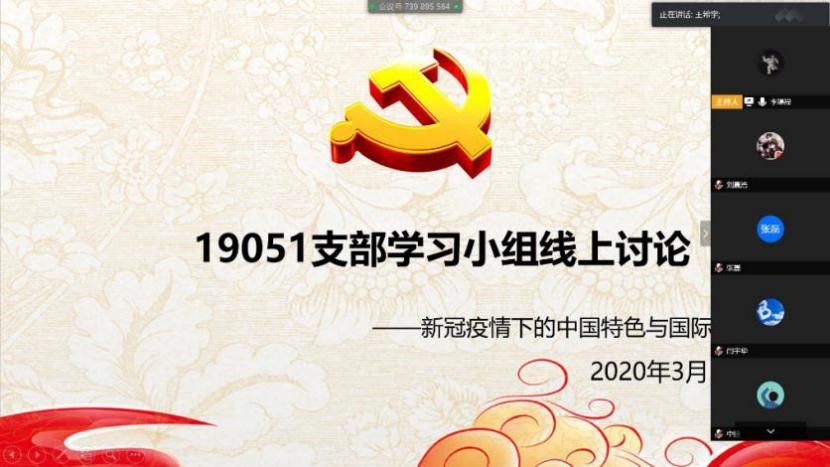 硕士生19051学生党支部响应学院的组织安排,开展了主题为“新冠疫情下的中国特色与国际比较”的线上集中学习活动。同时,为加强支部积极分子培养工作,支部成立了新的学习小组,让积极分子们与支部党员们一起参与到集中学习中。