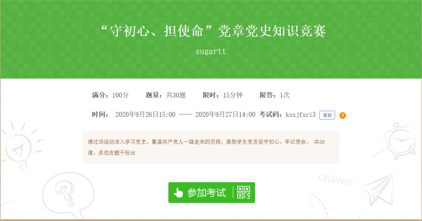 活动开展前期,博士生19051学生党支部与大飞机班19DF学生党支部的支委进行充分调研,选取题库,于2020年9月26日15:00线上发布试题,涵盖党史、新中国史、改革开放史、社会主义发展史和党章知识等内容。