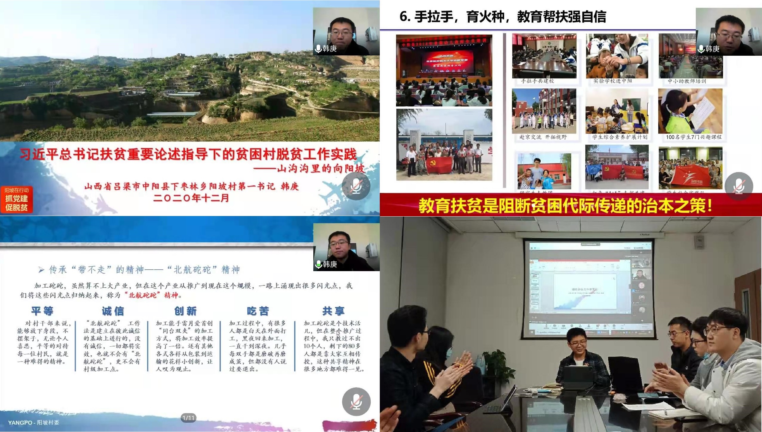 12月23日,支部以访谈交流会的形式联系北航定点扶贫单位——山西省中阳县阳坡村党支部,采用线上会议的形式,与北航驻中阳县扶贫干部、阳坡村第一书记韩庚进行交流学习,韩庚书记向我们介绍了在脱贫扶贫过程中传承的“带不走”信念,以及包含“平等、诚信、创新、吃苦、共享”的“北航砣砣”精神。我们了解了他们在实际工作中遇到的问题,学习了当地脱贫的成功经验与教训,并且对想要了解和探究的问题同韩庚书记进行讨论。在同韩庚书记交流的过程中,各位党员同志意识到“理论联系实际”的重要性,认识到基层工作的复杂性与实践性。