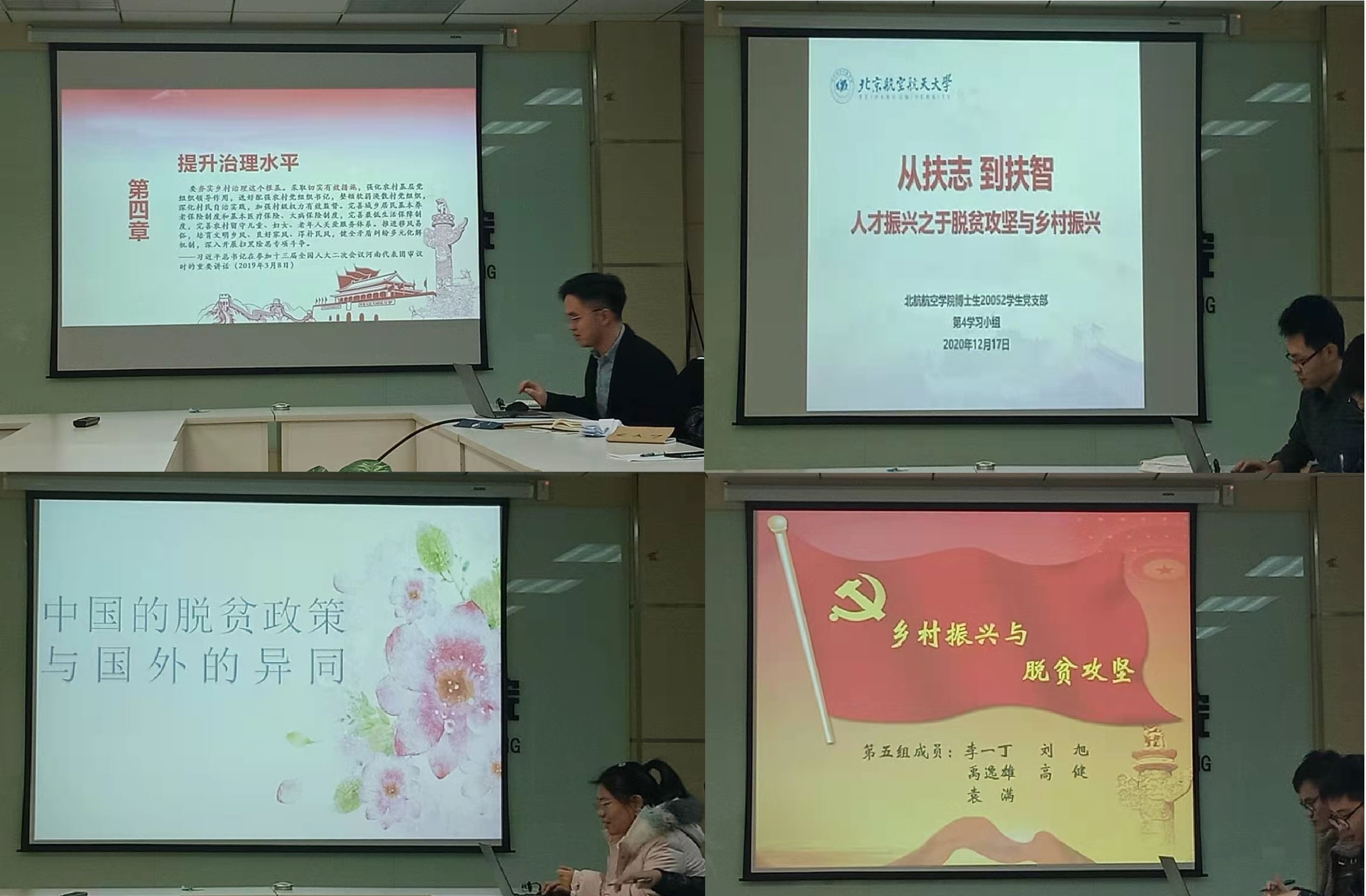 12月17日,支部举行学习分享会,大家以学习小组的形式阅读扶贫攻坚、脱贫致富相关的书籍和文献,观看纪录片,对脱贫攻坚过程中的经验教训进行深入剖析。各个学习小组既从宏观角度讨论了中国脱贫方案的前因后果,利弊得失,也在实践的角度一起学习了基层驻村干部们的亲身扶贫经历。